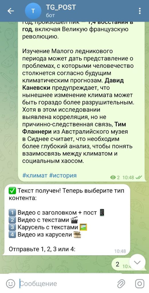 Отправляете текст идеи или поста со своего телефона — где угодно, даже на ходу. Можно переслать пост из канала телеграм, просто отправить скопированный из любого источника текст или дать задание ИИ написать текст на нужную вам тему полностью с ноля. В случае отправки чужого текста, он будет переписан с сохранением смысла на будет уже уникальным.