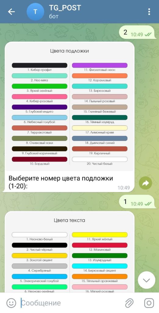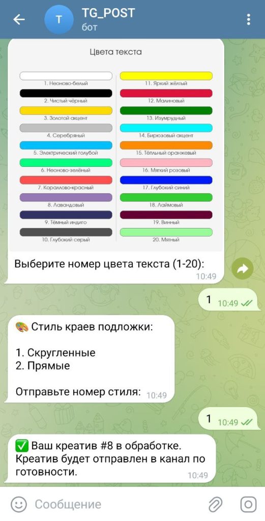 Получаете готовый креатив — программа сама отправит его в указанный вами Telegram-канал.